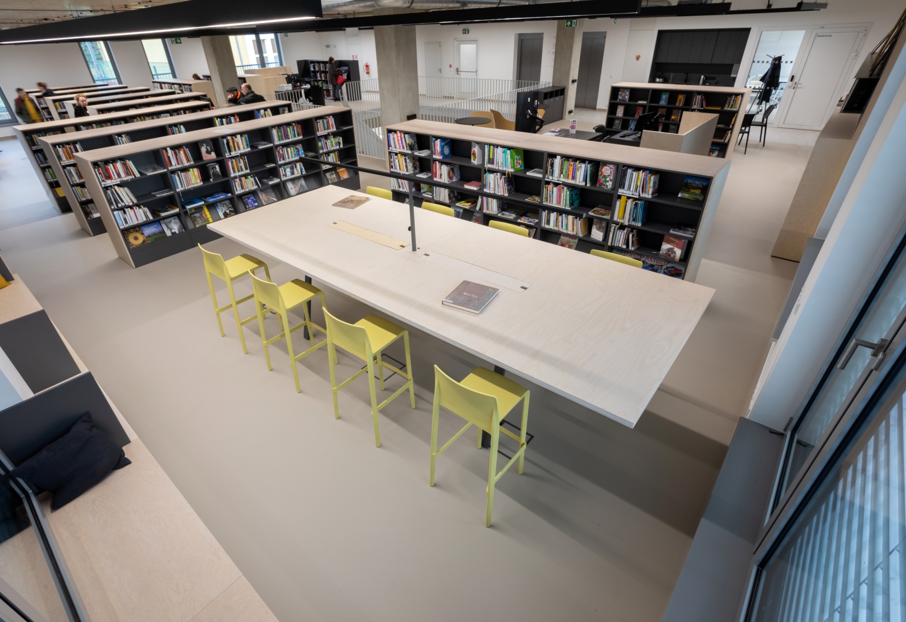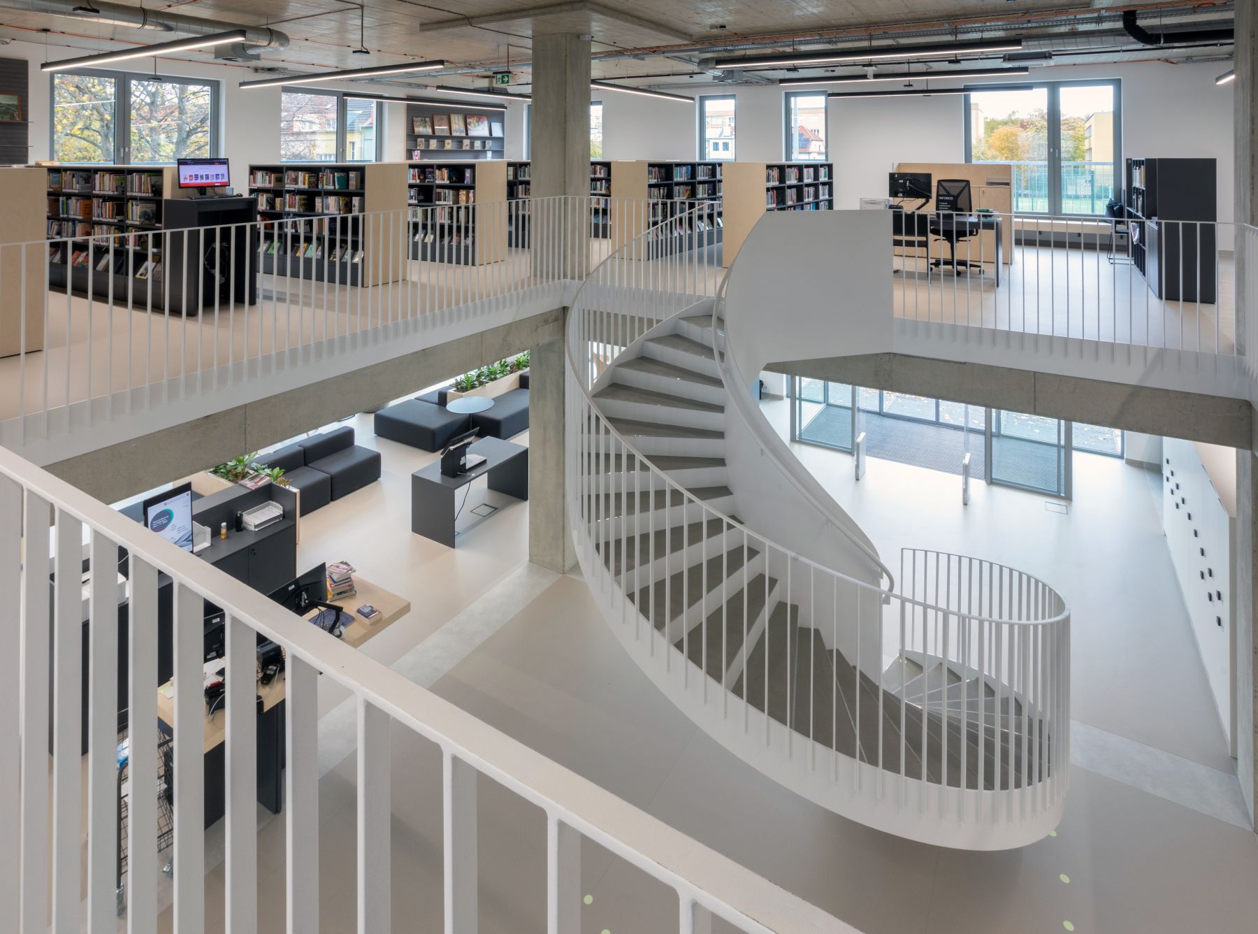 Pro knihovní služby veřejnosti slouží 1. a 2. nadzemní podlaží. Jedná se o otevřený a prosvětlený prostor spojený točitým schodištěm.